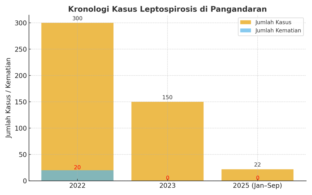 Berdasarkan catatan resmi, Kabupaten Pangandaran sempat mencatat rekor tertinggi kasus kematian akibat leptospirosis di Jawa Barat pada 2023. Setahun sebelumnya, pada 2022, tercatat 300 warga terjangkit, dengan 20 korban meninggal dunia. Setelah penanganan intensif sepanjang 2023, angka kematian dapat ditekan hingga nol.