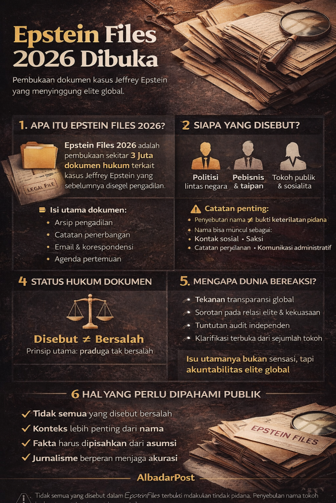 albadarpost.com, BERITA DUNIA – Rilis Epstein files 2026 kembali mengguncang dunia. Sekitar tiga juta halaman dokumen yang berkaitan dengan kasus Jeffrey Epstein mulai dibuka ke publik. Meski sebagian besar arsip bersifat administratif dan hukum, sorotan global langsung mengarah pada satu pertanyaan kunci: siapa saja yang disebut di dalamnya?