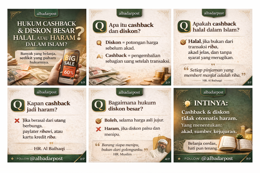 Cashback dan diskon besar tidak otomatis haram. Hukumnya bergantung pada skema, akad, dan dampak transaksi. Selama tidak terhubung dengan riba, penipuan, atau syarat batil, promo tersebut tetap berada dalam koridor halal.