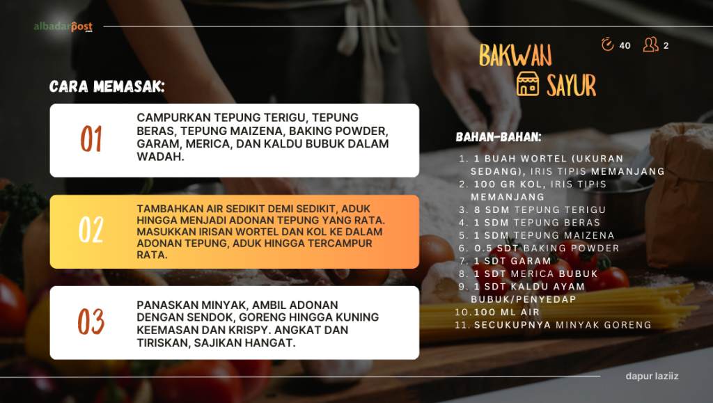 albadarpost.com, LIFESTYLE – Bakwan sayur kembali menjadi pilihan banyak rumah tangga sebagai camilan praktis yang hemat biaya dan mudah diolah. Di tengah kenaikan harga sejumlah bahan pangan, menu sederhana berbahan wortel dan kol ini dinilai mampu menjawab kebutuhan pangan rumahan tanpa mengorbankan rasa dan nilai gizi.