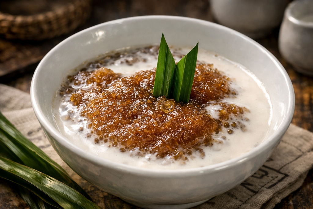 Menu ini sering muncul sebagai bubur khas Nusantara saat Ramadan. Rasanya yang manis dan hangat sangat cocok untuk mengawali waktu berbuka. Selain itu, kandungan pati dalam sagu memberikan energi yang bertahan cukup lama.