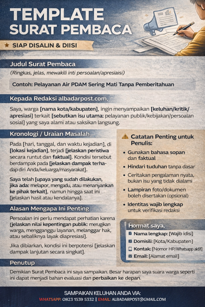 Rubrik Surat Pembaca di albadarpost.com tidak hadir sebagai tempat mengeluh tanpa arah. Sebaliknya, rubrik ini kami siapkan sebagai ruang kontrol sosial, tempat warga menyampaikan persoalan pelayanan publik seperti listrik, air bersih, BPJS, pendidikan, hingga transportasi umum.